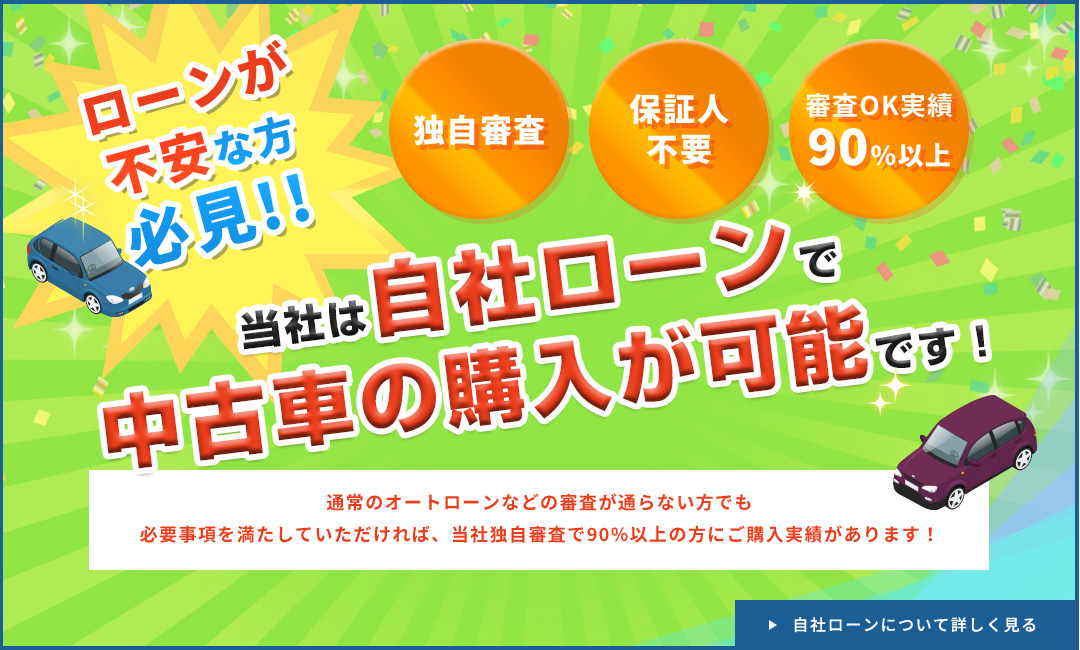 安心の全車鑑定書付き!当店では、事情があって通常のローンが通らないけど現在は安定した生活と収入があり、月々のお支払いが確実に可能という方向けに自社ローンも取り扱っています。