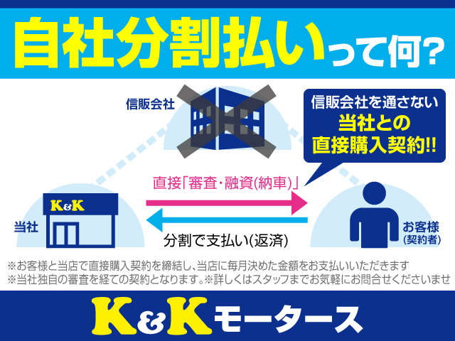 大好評自社ローン!審査無し!どなたでも購入出来ます!かんたん受付ですぐに回答いたします!どなたでもご利用可能なK&Kモータースの「自社分割」・「自社ローン」!ほしい車が必ず買えます!