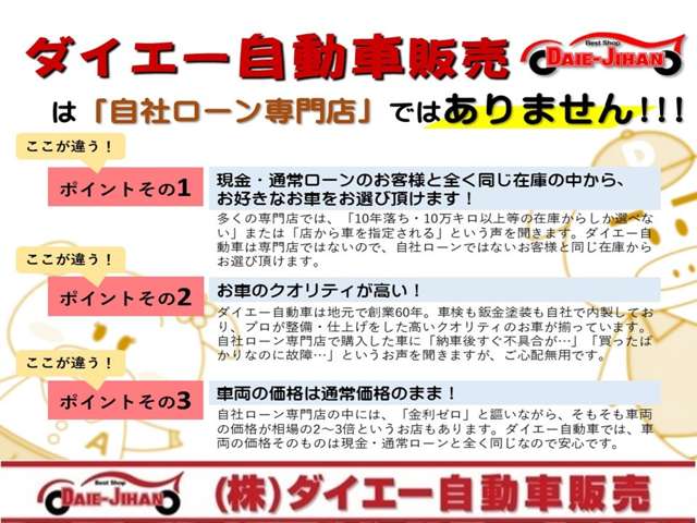 自社ローン専門店ではないので、現金やオートローンご利用の方と同じ在庫からお選びいただく、ハイクオリティなお車をお約束します!ぜひご来店のうえ、ご確認ください♪