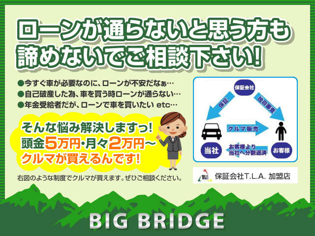 自社ローン・個人ローン取り扱い店!お車の購入を諦める前に、是非当社へご相談ください!!購入のサポートを全力でさせて頂きます。また、ローン審査は無料で承っておりますので、お気軽にご連絡ください!