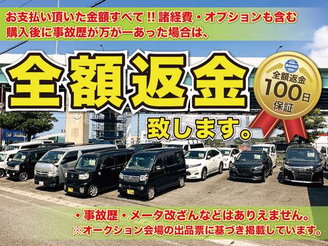 | 車両保証 | 無料保証付き(3カ月または3,000kmどちらか先に達するまで、当社規定により一部対象外車両あり)、100日間全額返金保証、その他ご希望に応じた有償保証あり |