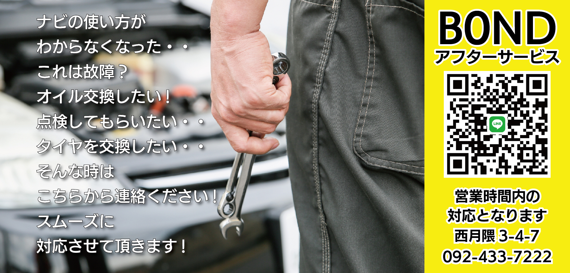 | 事業内容 | 中古車販売、車検、整備、板金、塗装、エアロ・オーディオ・ナビ・ドラレコ取付、東京海上日動保険代理店 平成16年度~ 福岡商工会議所会員 社団法人自動車公正取引協議会会員 平成19年度~ 福岡法人会会員 |