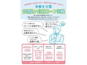 「車を持ちたいけどローン審査が不安…」という方のために、自社ローンをご用意しています。クレジットカードや一般的なローンが難しい方も、無理なく車を手に入れ、安心してカーライフをスタートしていただけます!